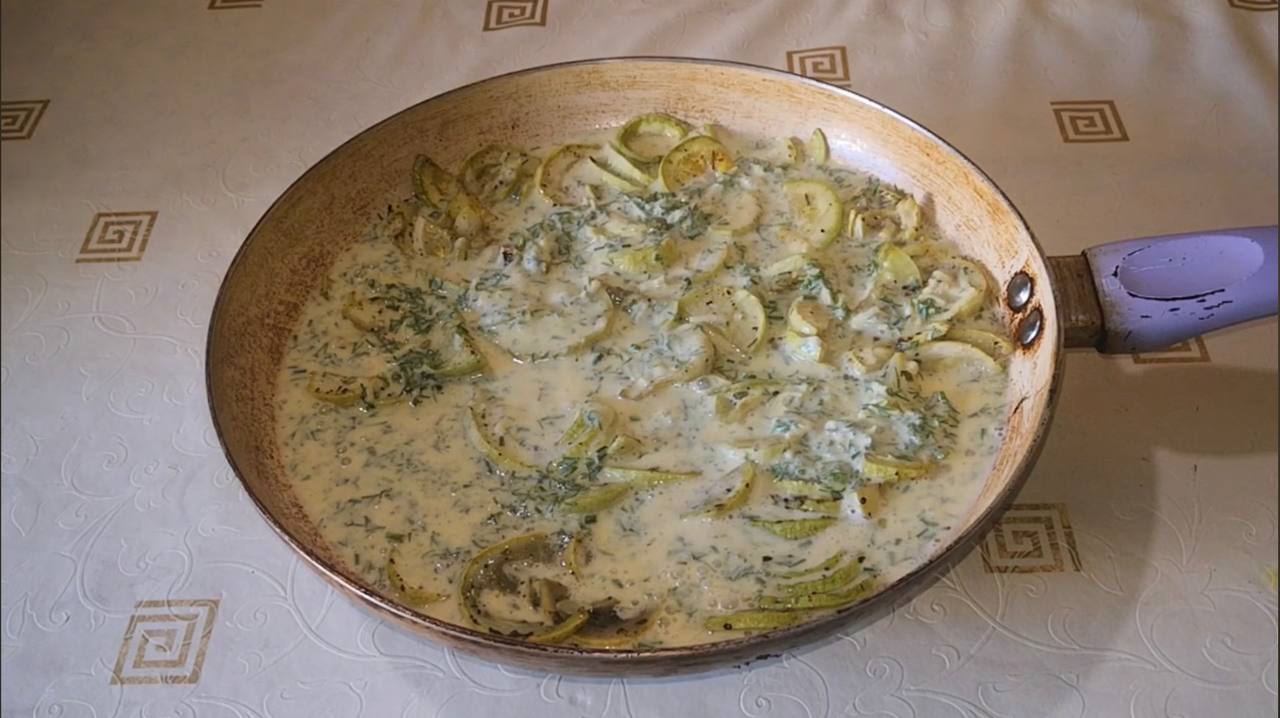 Обсмажені кабачки повертаємо назад у сковорідку. Зверху заливаємо сметанним соусом. Складаємо шарами.