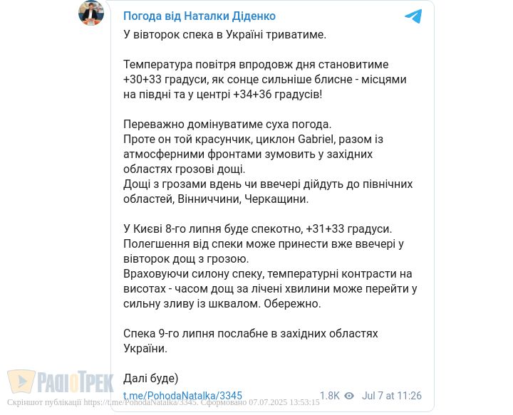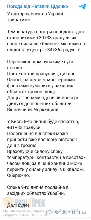 Повсюди буде сухо, лише циклон Gabriel, разом з атмосферними фронтами на Заході країни зумовить грозові дощі, які дійдуть аж до північних областей, Вінниччини, Черкащини.