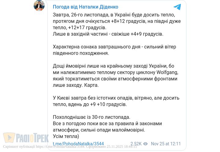 Завтра, 26 листопада, в Україні буде тепла погода.