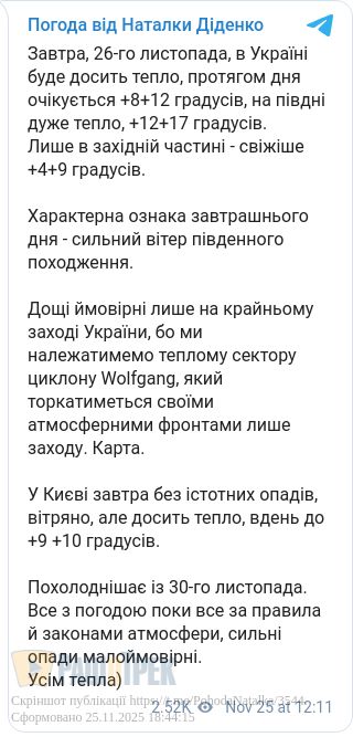 Протягом дня очікується +8...+12 градусів, на Півдні буде аж до +12...+17 градусів. Лише в західній частині буде свіжіше, до +4...+9 градусів, повідомила синоптик Наталка Діденко.