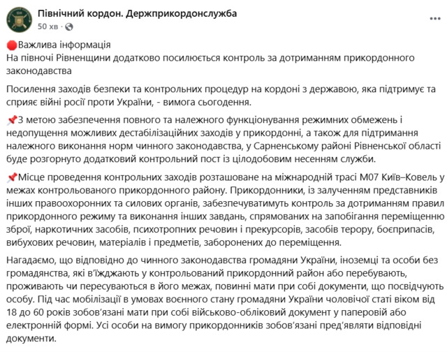 Новий цілодобовий блокпост зʼявиться на Сарненщині
