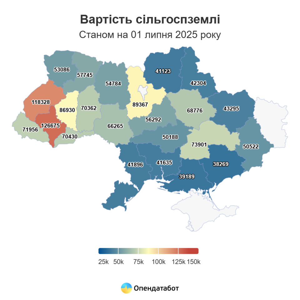Найдорожча земля на Івано-Франківщині, Львівщині та Київщині, а найнижча — у Запорізькій, Херсонській та Чернігівській областях.