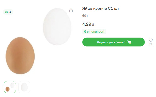 Згідно з моніторингом OBOZ.UA, з початку липня до 10 серпня 2025 року ціна на нефасовані яйця (категорії С1) також зросла – одразу на 0,56 грн/штука (5,6 грн/десяток). Так, у великих мережах супермаркетів небрендовані яйця, що продаються поштучно, коштували 5,44 грн/штука (54,4 грн/десяток).