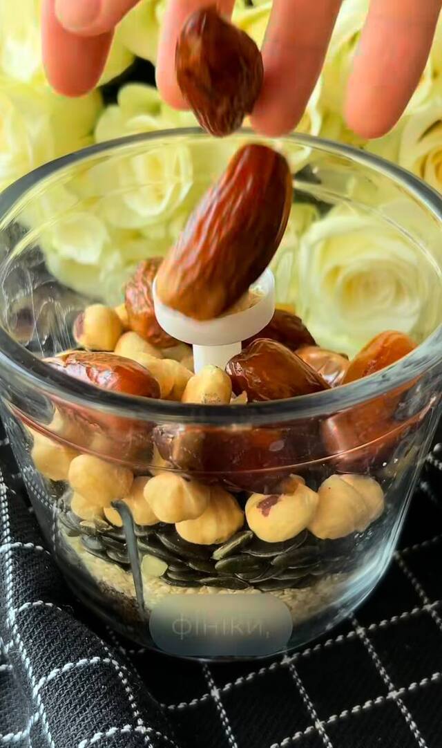У чашу блендера покладіть льон, кунжут, гарбузове насіння, лісові горіхи, фініки і все перебийте до однорідної маси.