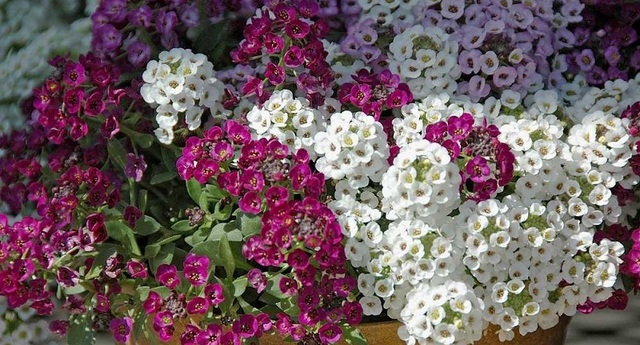 Аліссум - ґрунтопокривна рослина, яка сама розростається і не боїться посухи. Має різні забарвлення, тож можна зробити кольорову композицію.