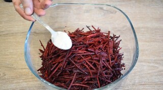Сирий буряк чистимо і натираємо на тертці для корейської моркви, додаємо сіль, ретельно перемішуємо і залишаємо на 30 хв, щоб буряк пустив сік.