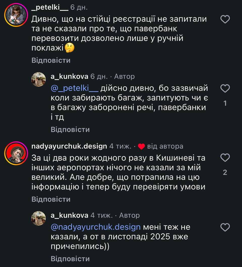 Також Аліна наголошує – перевезення павербанків можливе лише у ручній поклажі. Їх не можна здавати у зареєстрований багаж.