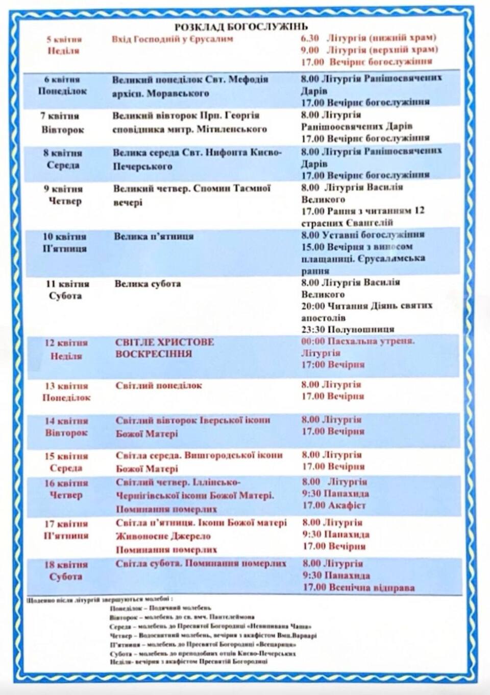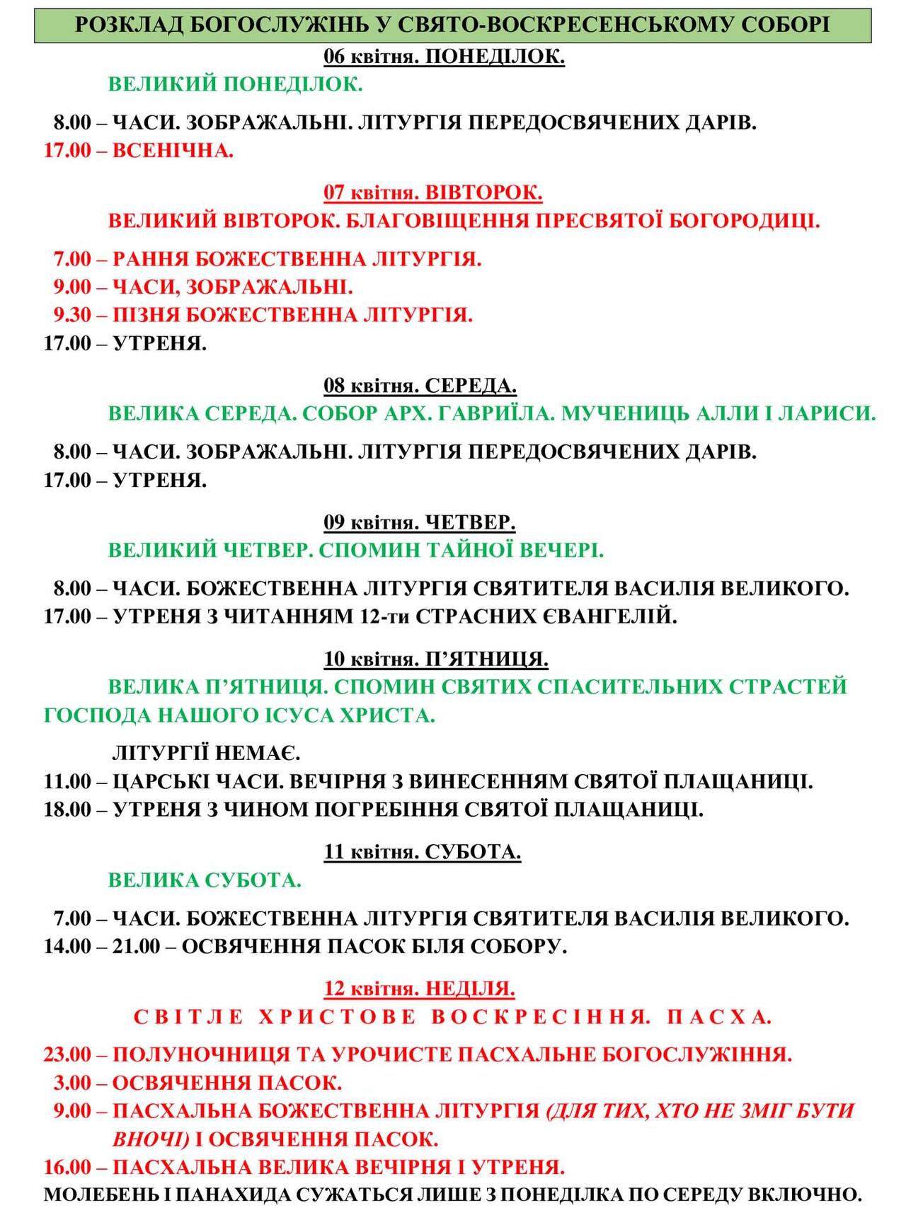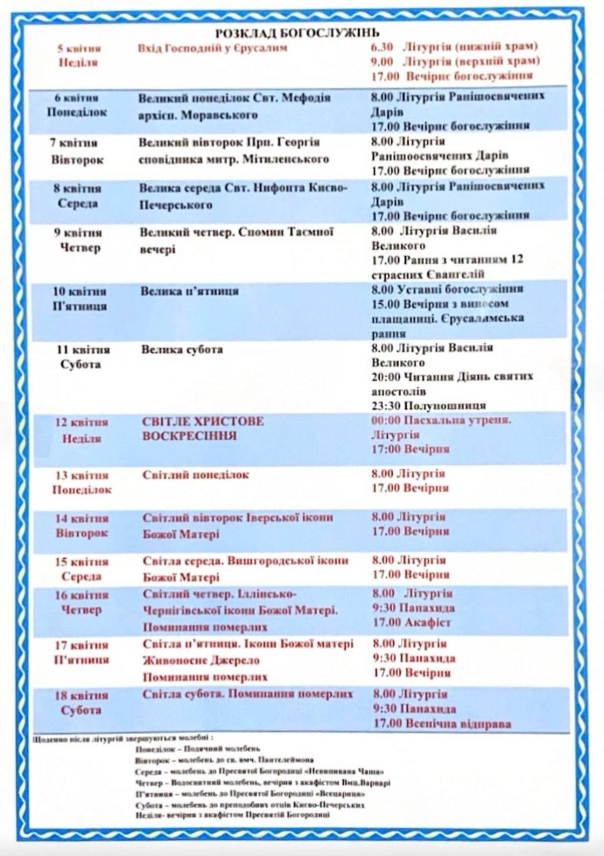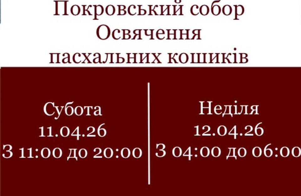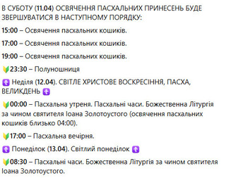 У Свято-Воскресенському соборі ПЦУ освячення пасок відбудеться в суботу з 14-ї до 21-ї години, у неділю — з 3-ї до 9-ї.