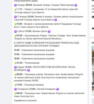 У Свято-Воскресенському соборі ПЦУ освячення пасок відбудеться в суботу з 14-ї до 21-ї години, у неділю — з 3-ї до 9-ї.