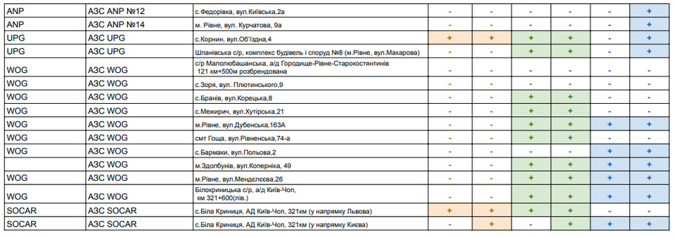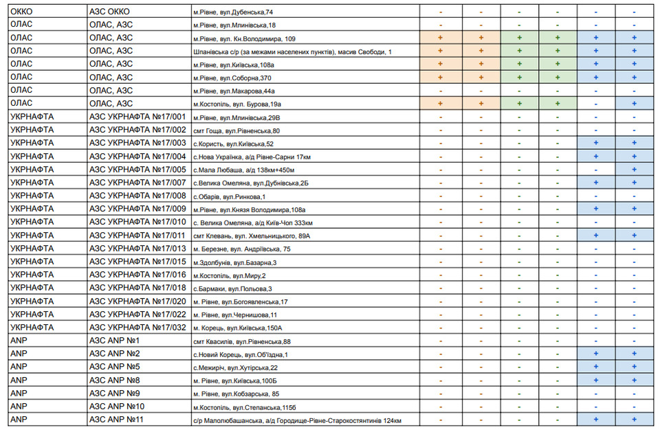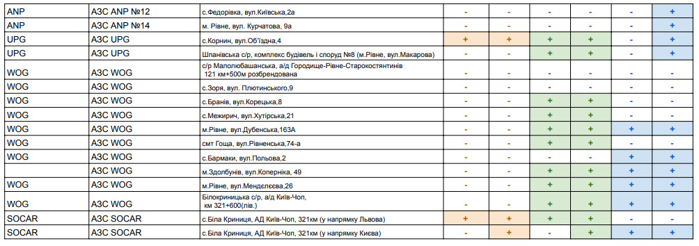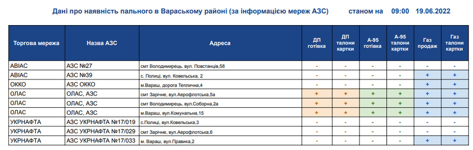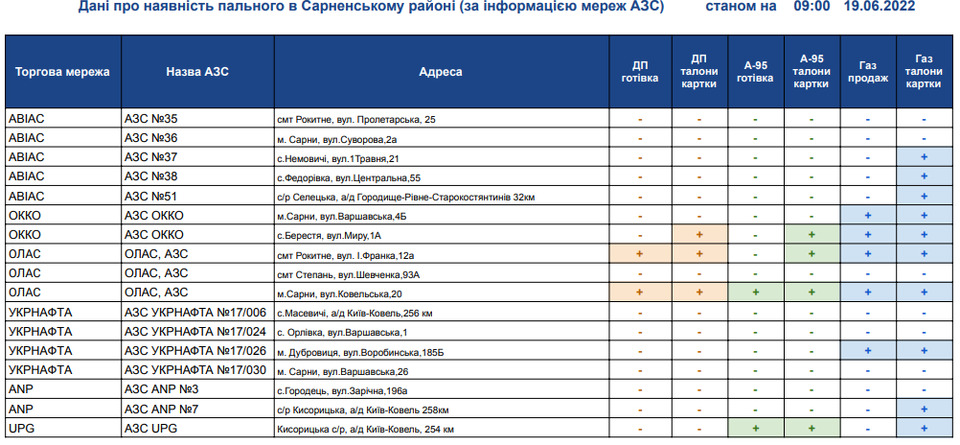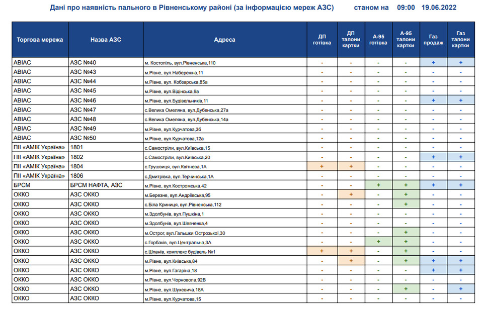 Рівненська обласна військова адміністрація щоденно інформує щодо наявності пального на АЗС Рівненщини в розрізі районів.