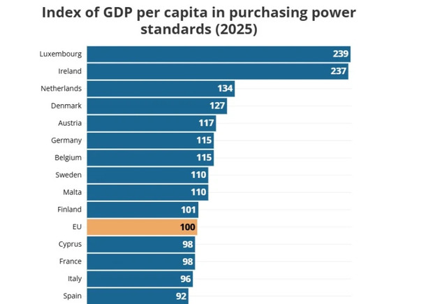 Середній показник по Європейський Союз становить приблизно 41 600 євро на людину — це базовий рівень (100%), з яким порівнюють інші країни.