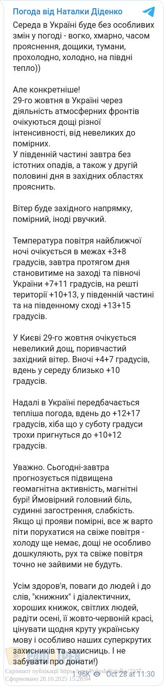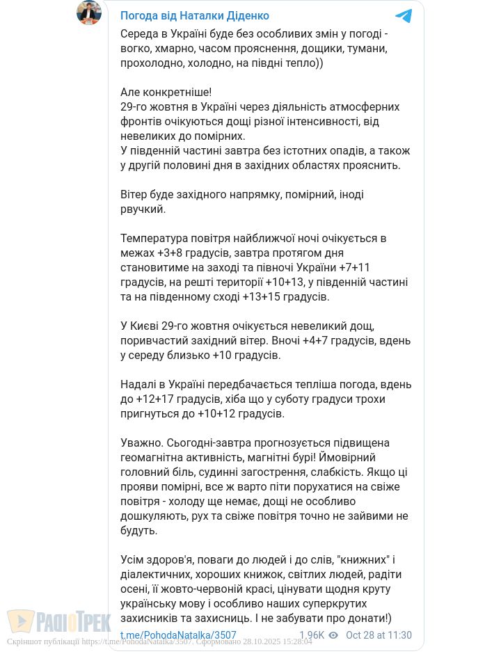 Завтра, 29 жовтня, через діяльність атмосферних фронтів в країні очікуються дощі різної інтенсивності, повідомила синоптик Наталка Діденко.