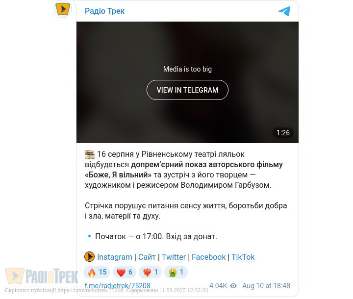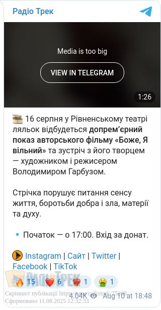 Допрем’єрний показ фільму «Боже, Я вільний» відбудеться у Рівненському театрі ляльок. Також глядачі зможуть зустрітися з автором стрічки — художником і режисером Володимиром Гарбузом.