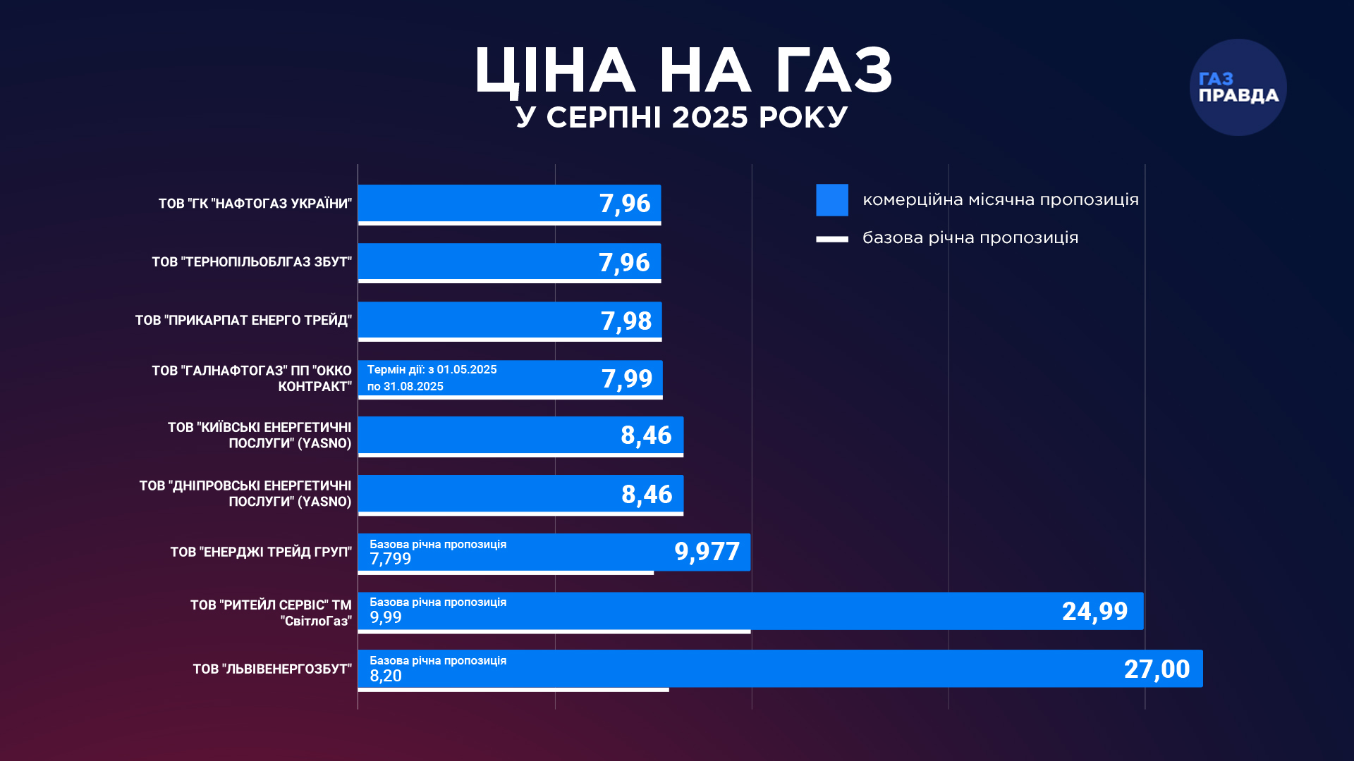 На ринку постачання природного газу побутовим споживачам, за даними ГазПравди, присутні 9 постачальників, 5 з яких пропонують і місячні (ринкові), і річні тарифи.