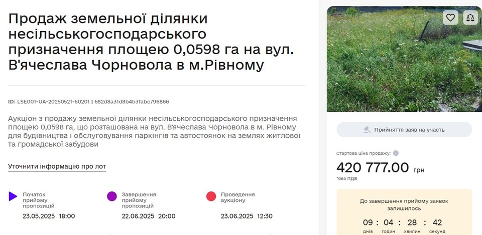 А трохи більша ділянка, площею майже 6 соток, на старті аукціону коштує 420 тисяч грн.