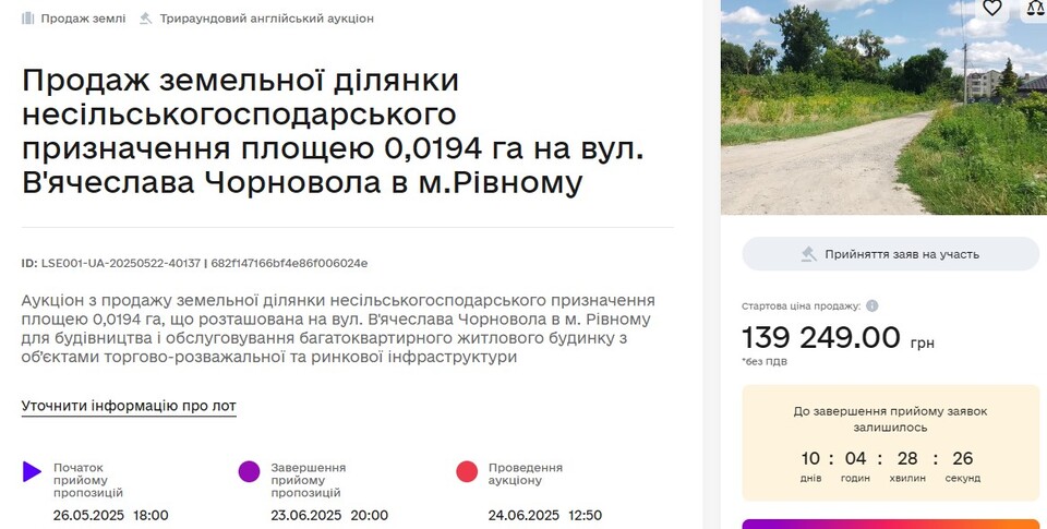 Ділянку на Чорновола у Рівному продають за 139 тисяч грн (ФОТО)