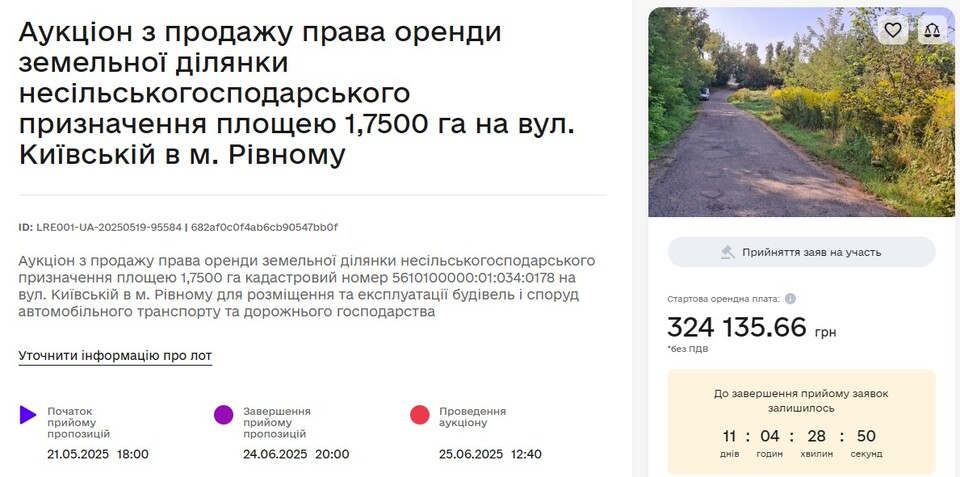 Три земельні ділянки, які належать Рівненській тергромаді, незабаром продадуть на аукціоні. На Київській продають 175 соток зі стартовою ціною майже 325 тисяч грн.