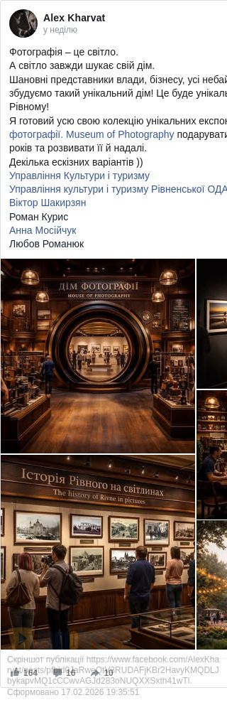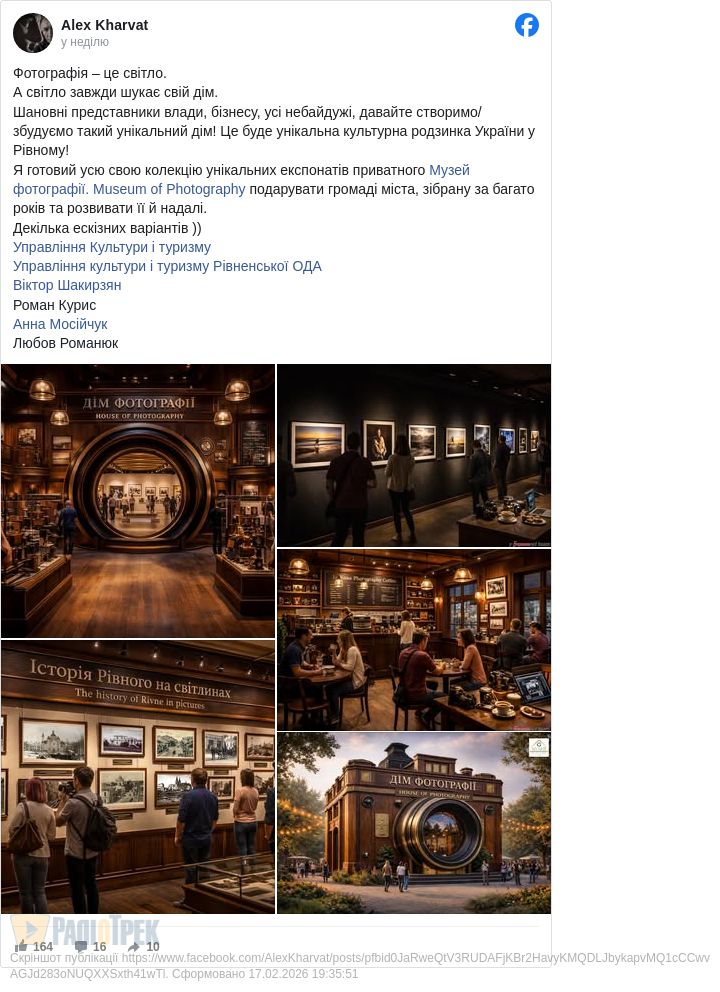 Зокрема Олександр Харват уже давно закликає міську владу (ще з часів Чайки) створити у Рівному «Дім Фотографії»