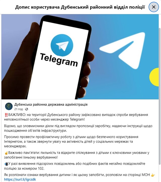 Спробу вербування підлітка зафіксували на Рівненщині. Відомо, що у поле зору зловмисників потрапила дитина з Дубенського району. У Телеграмі неповнолітній отримав повідомлення, у якому йому пропонували заробіток.