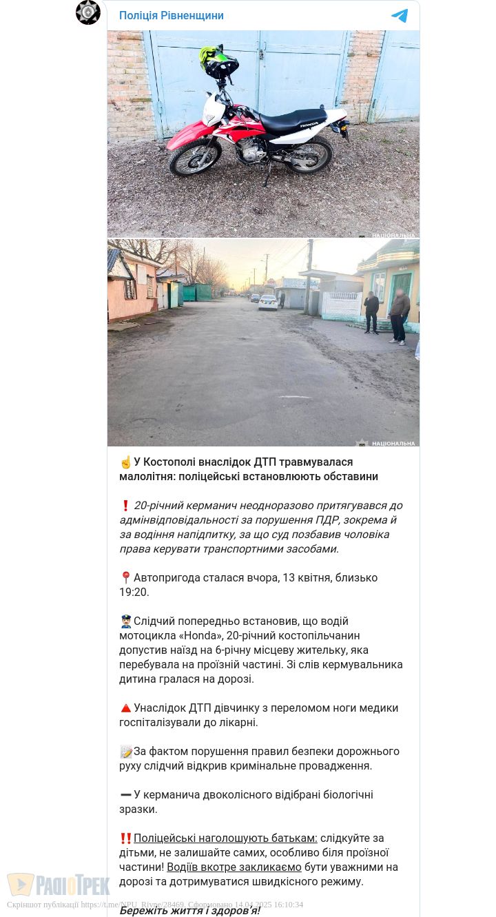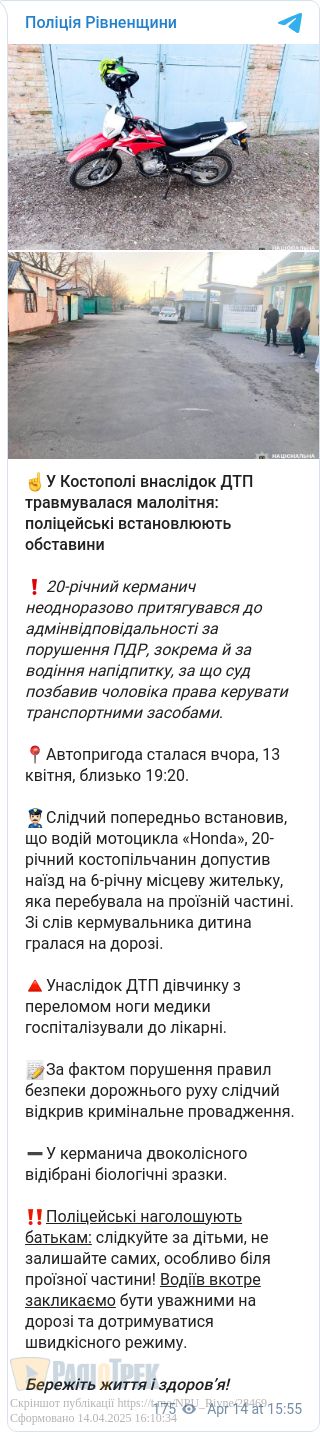 6-річна дівчинка потрапила під колеса мотоцикла в Костополі.