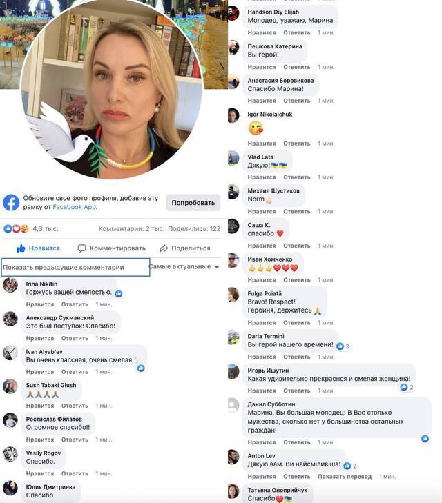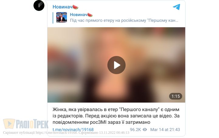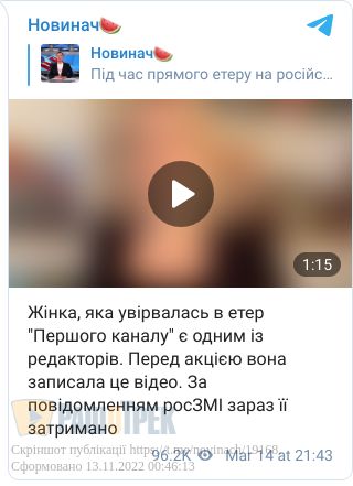 Дівчина, яка увірвалася в прямий ефір програми «ВРЕМЯ» з плакатом проти війни в Україні, виявилася однією з редакторів головного телеканалу путінської Росії.
