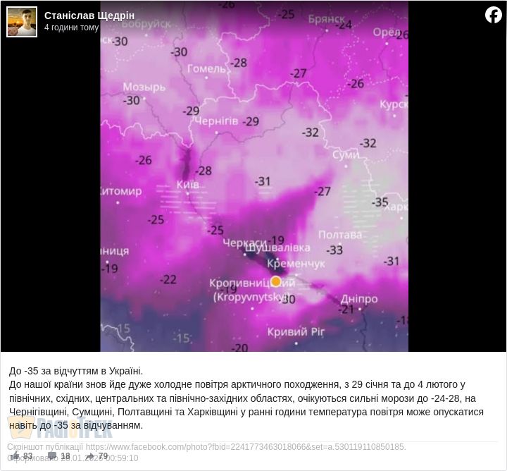 До -35 за відчуттям в Україні. До нашої країни знов йде дуже холодне повітря арктичного походження, з 29 січня та до 4 лютого у північних, східних, центральних та північно-західних областях, очікуються сильні морози до -24...-28, на Чернігівщині, Сумщині, Полтавщині та Харківщині у ранні години температура повітря може опускатися навіть до -35 за відчуванням, – додав Станіслав Щедрін.