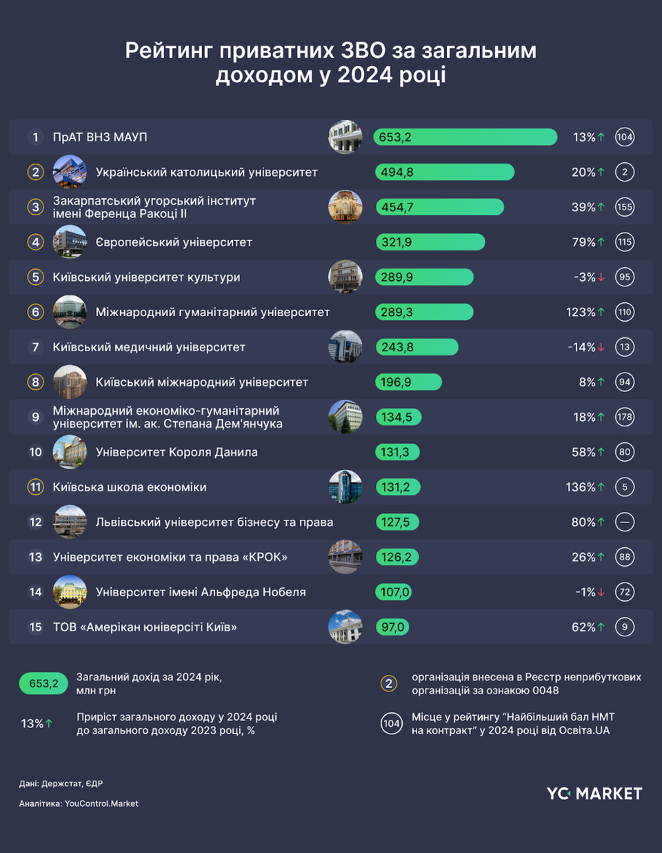 Youcontrol подає перелік найдохідніших приватних університетів країни.