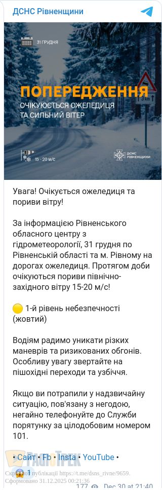 Сьогодні, 31 грудня, на дорогах Рівного та області пануватиме ожеледиця, а також буде вітряно.