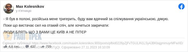 Я був в полоні, російська мене тригерить, буду вам вдячний за спілкування українською, дякую.