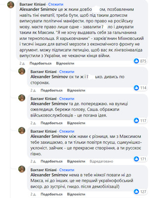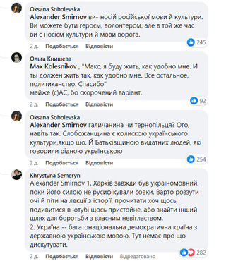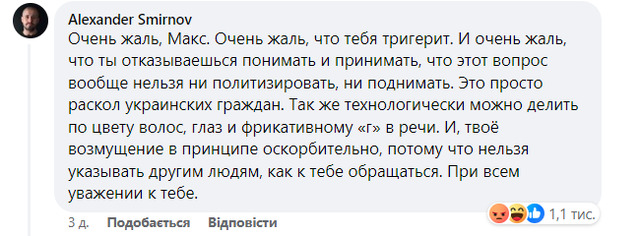 Дуже шкода, Максе. Дуже шкода, що тебе це тригерить. І дуже шкода, що ти відмовляєшся розуміти та приймати, що це питання взагалі не можна ні політизувати, ні порушувати. Це просто розкол українських громадян. Так само технологічно можна ділити за кольором волосся, очей та фрикативним «г» у вимові. І твоє обурення в принципі образливе, тому що не можна вказувати іншим людям, як до тебе звертатися. Зі всією повагою до тебе», – прокоментував Смірнов.