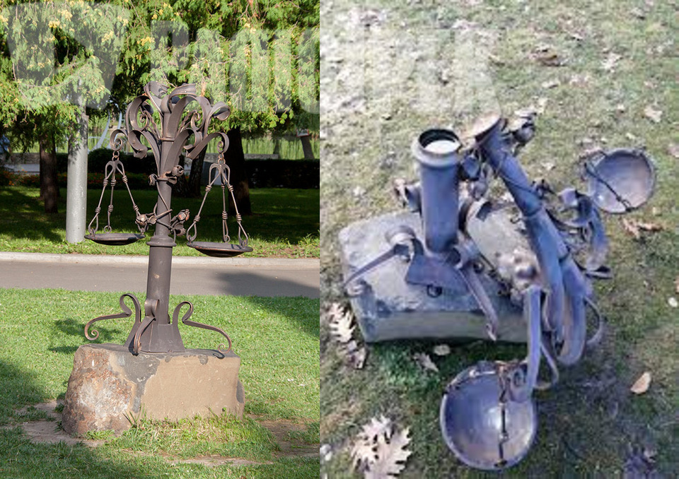 Невідомі пошкодили одну з фігур кованого Зодіаку у центрі Рівного. На це звернули увагу після новорічних свят журналісти Суспільного. Поламані «Терези» забрали на реставрацію.