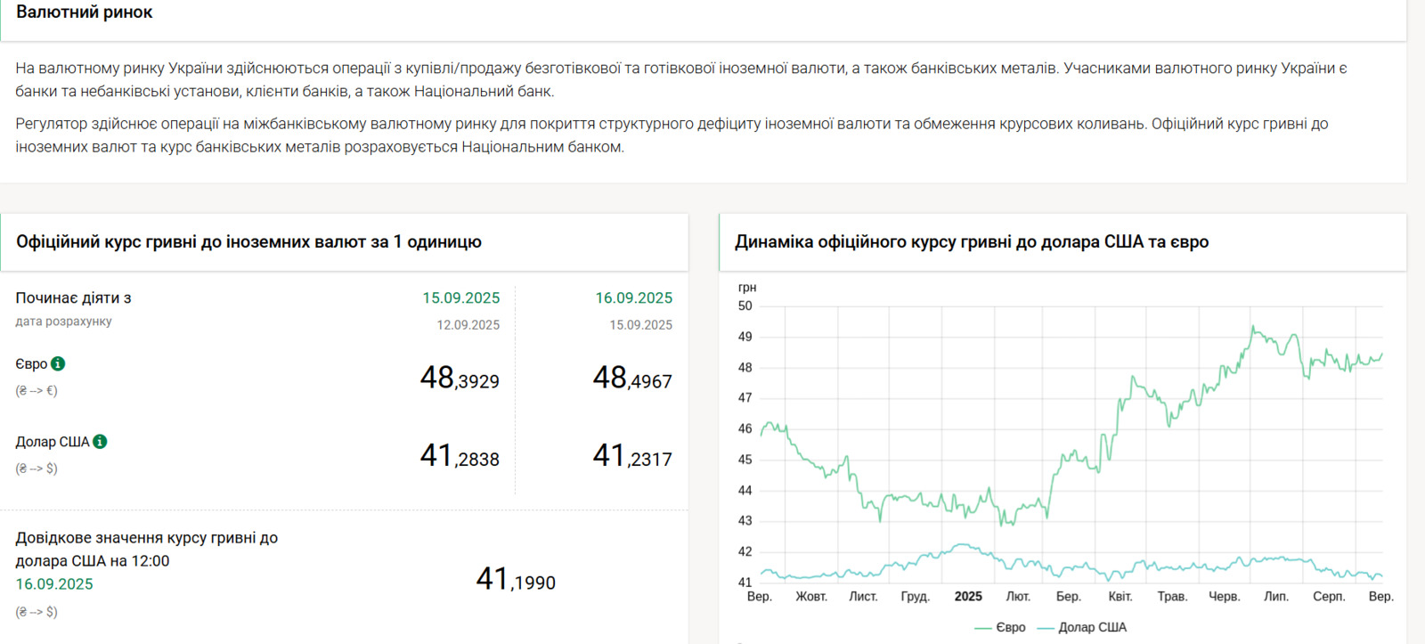 На міжбанку долар трохи впав до 41,22–41,25 грн за купівлю та продаж, а на готівковому ринку падіння помітніше — до 41,50 грн.
