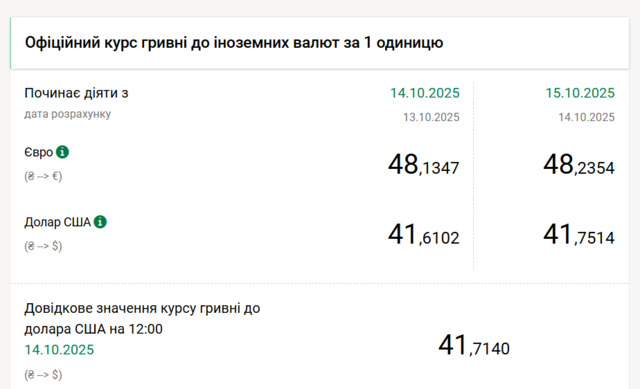 Станом на 14 жовтня офіційний курс долара встановлено на рівні 41,61 грн, що лише трохи вище попереднього показника.