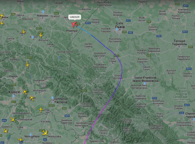 За даними порталу Flightradar24, над територією України зафіксували літак Airbus A380-842 компанії Emirates Airline з ОАЕ.Кордон України літак перетнув в районі Закарпаття. В районі Стрия, що на Львівщині, борт змінив курс, а потім перетнув кордон Польщі.