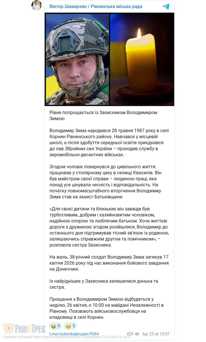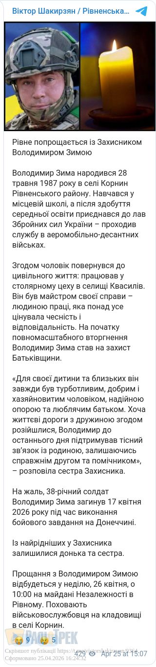 Прощання відбудеться 26 квітня о 10:00 на майдані Незалежності. Поховають воїна у селі Корнин.