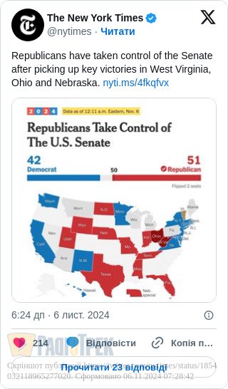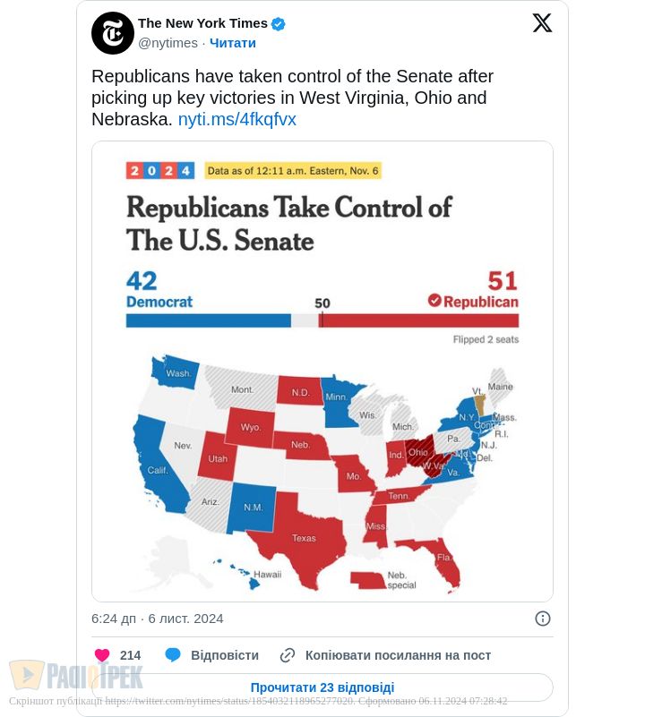 Також Республіканці перемагають на виборах до Сенату: