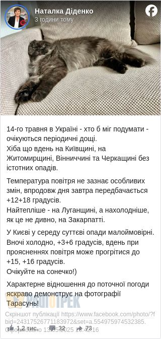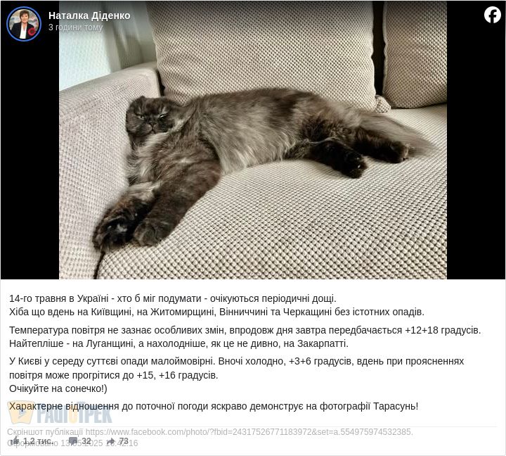 Завтра, 14 травня, в Україні очікуються періодичні дощі. Без істотних опадів вдень буде лише на Київщині, Житомирщині, Вінниччині та Черкащині, повідомила синоптик Наталка Діденко.