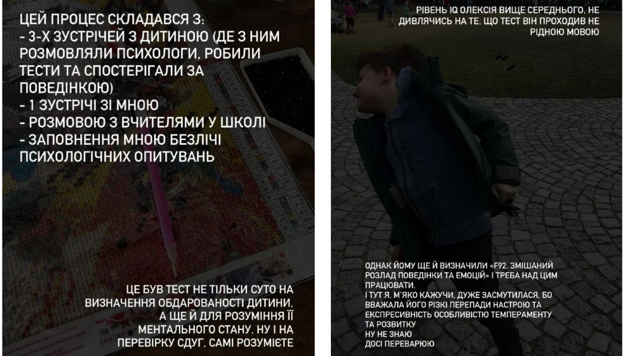 - Цей процес складався з трьох зустрічей з дитиною, де з ним розмовляли психологи, робили тести та спостерігали за поведінкою, однієї зустрічі зі мною, розмовою з вчителями у школі, заповнення мною безлічі психологічних опитувань. Це був тест не тільки суто на визначення обдарованості дитини, а ще й для розуміння її ментального стану», - поділилася Олена.