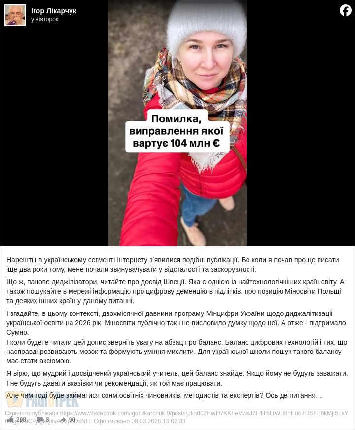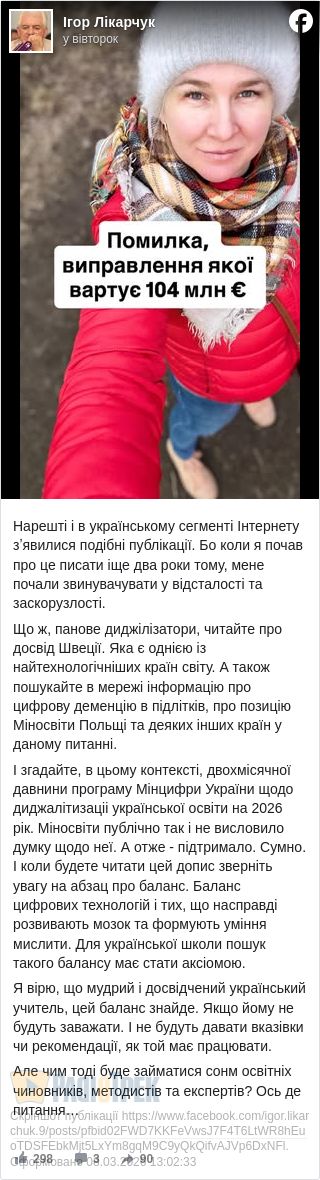 Відомий український освітянин Ігор Лікарчук днями звернув загальну увагу на допис, який розповідає про наслідки запровадження цифрових технологій і загалом т.з. «диджиталізації» у школах Швеції.