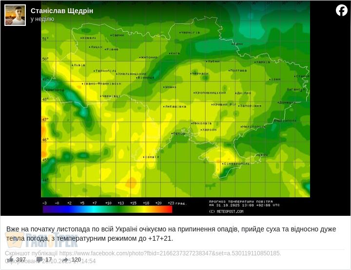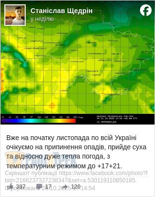 На початку листопада по всій країні очікується припинення опадів, а стовпчики термометрів підіймуться до +17...+21 градуса, повідомив народний синоптик Станіслав Щедрін.