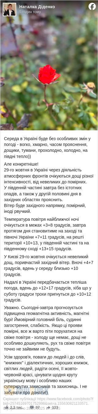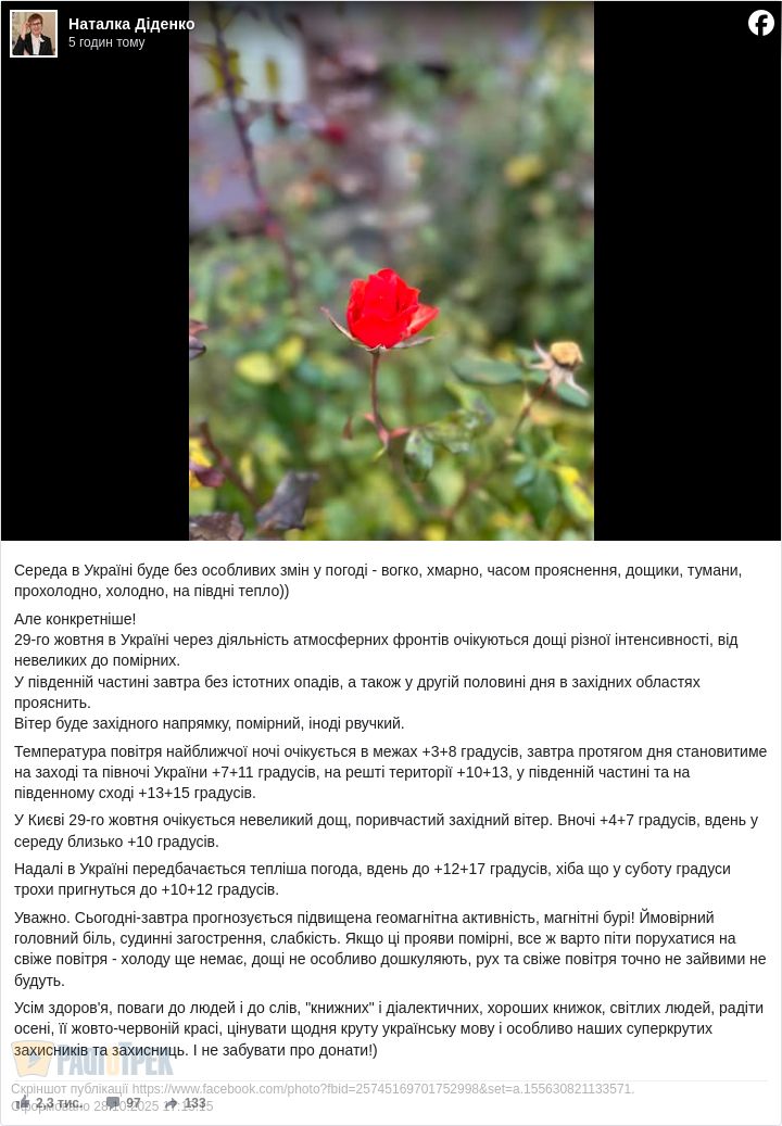 Синоптик Наталка Діденко також прогнозує потепління. Вдень, за її словами, може бути до +12...+17 градусів. Лише у суботу 1 листопада похолоднішає до +10...+12 градусів.