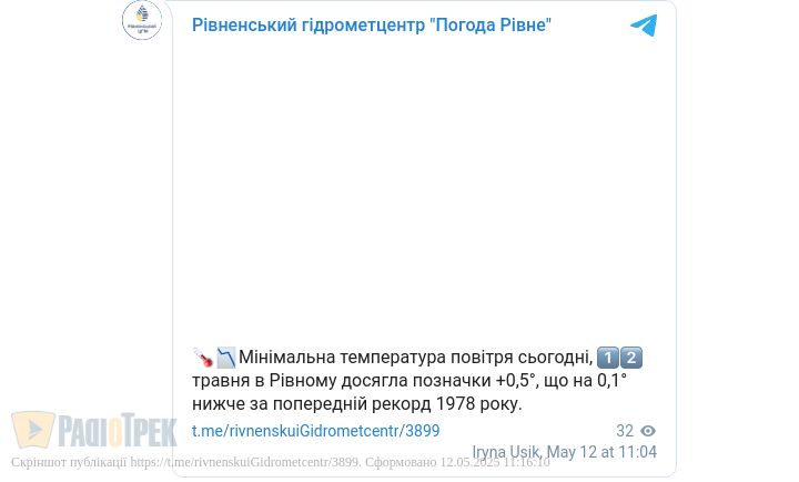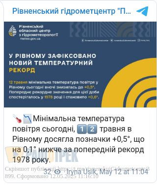 Минулої ночі температура повітря досягла позначки +0,5 градуса, що на 0,1 градуса нижче за рекорд 1978 року, коли стовпчики термометрів показали +0,6 градуса. Про це повідомили у Рівненському гідрометцентрі.