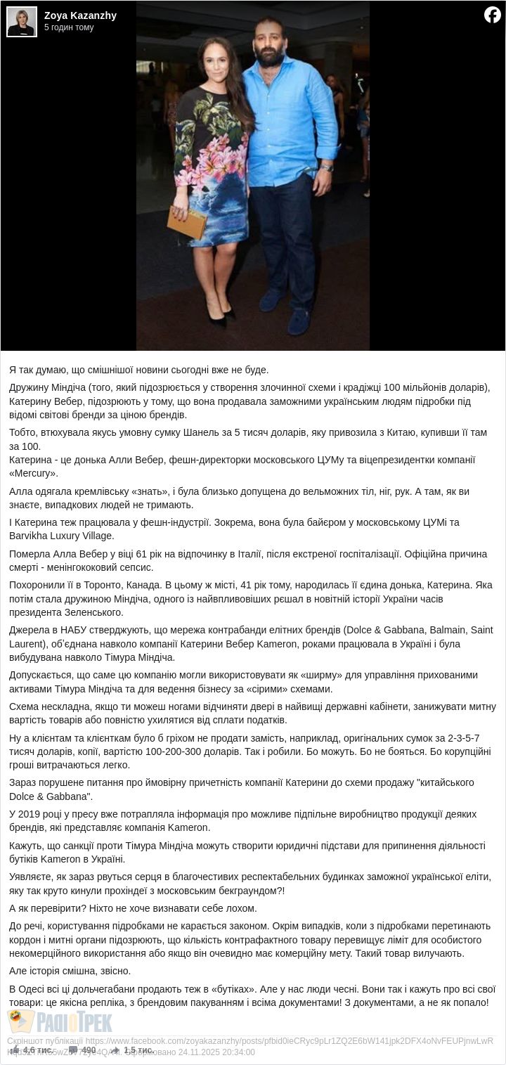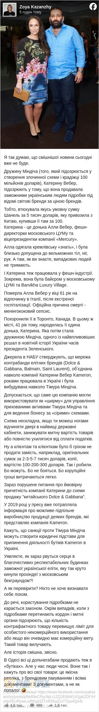 Джерела в НАБУ стверджують, що мережа контрабанди елітних брендів (Dolce & Gabbana, Balmain, Saint Laurent), обʼєднана навколо компанії Катерини Вебер Kameron, роками працювала в Україні і була вибудувана навколо Тімура Міндіча.
