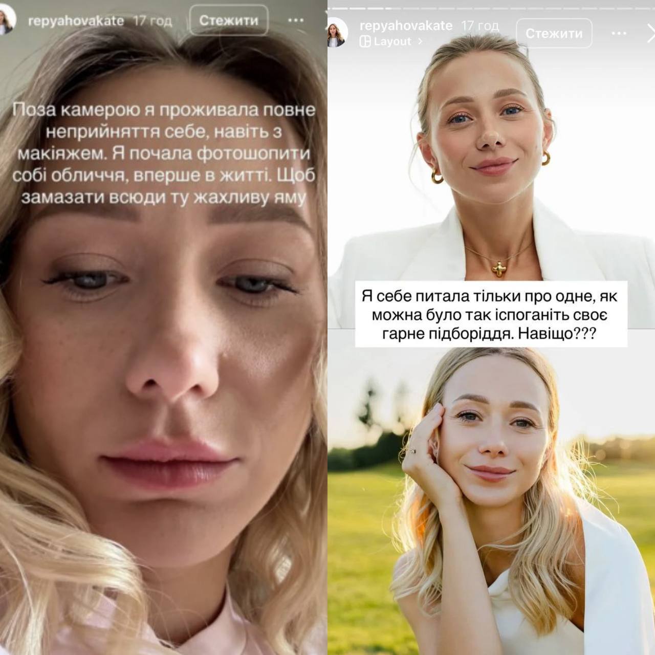 — Кожен день впродовж пів року я дивилася на себе в дзеркало і вмовляла подобатися собі. Я навіть почала фотошопити обличчя, щоб замазати цю яму. Як можна було так зіпсувати своє гарне підборіддя?! — написала Катерина.