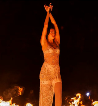 Пізніше вона змінила образ на прозору рожеву сукню поверх білизни та золотисте металеве боді.