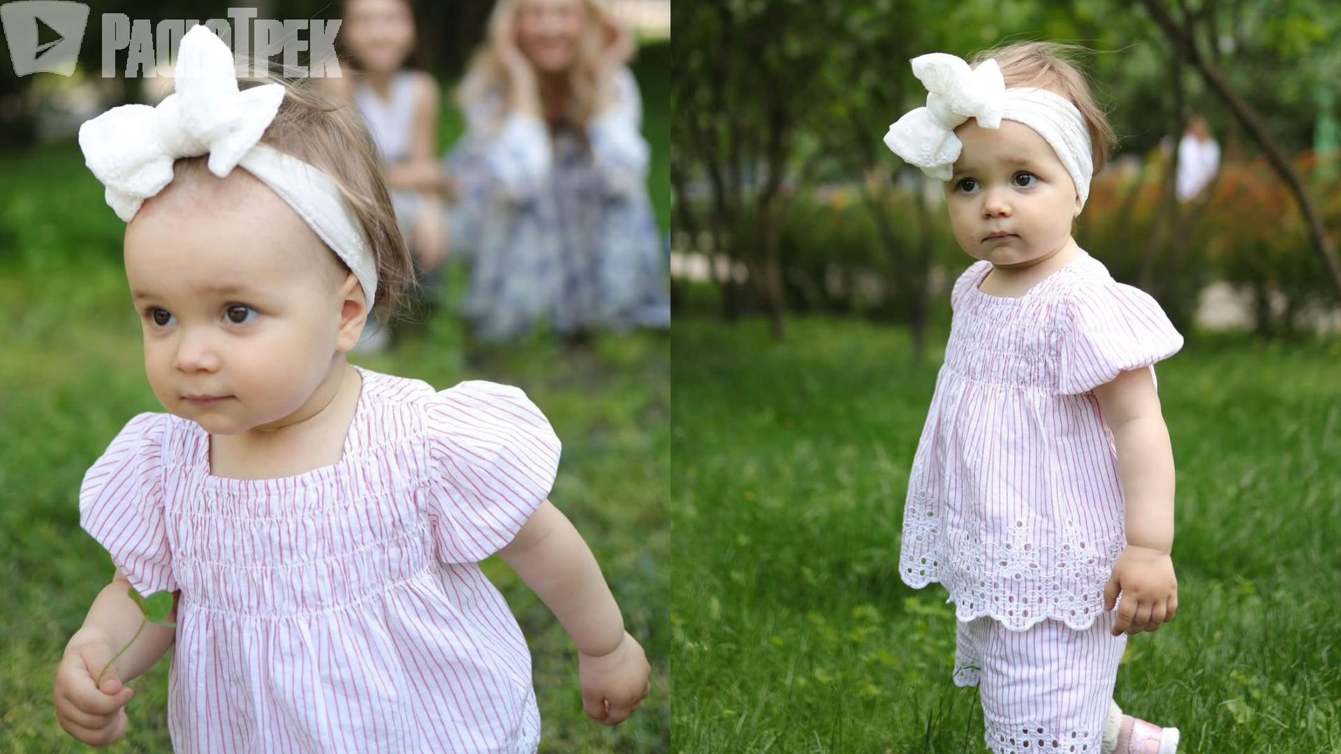 На фото дівчинка позувала в білому костюмі в рожеву смужку, а образ доповнив розкішний бант на голові.
