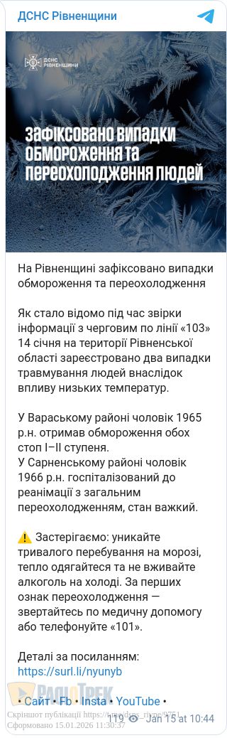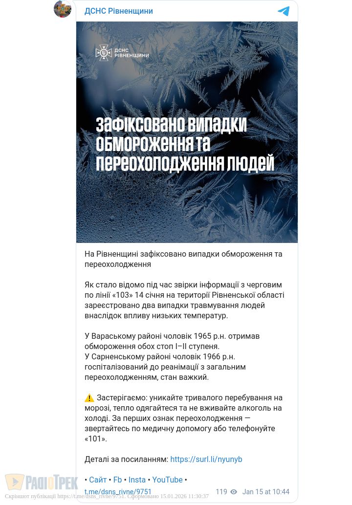 Напередодні у Вараському районі 60-річний чоловік отримав обмороження обох стоп першого–другого ступеня, а в Сарненському районі 59-річного чоловіка з важким загальним переохолодженням госпіталізували до реанімації.