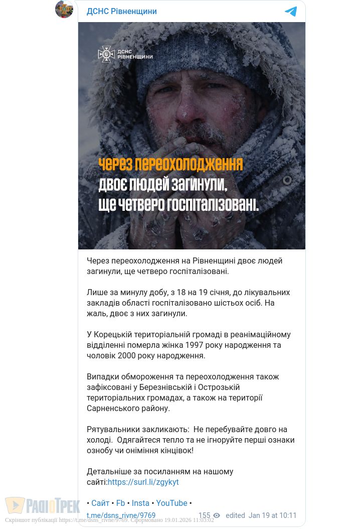 Загалом того дня до медзакладів області госпіталізували шістьох людей із переохолодженням та обмороженнями. Подібні випадки також зафіксували на Березнівщині, Острожчині та Сарненщині.