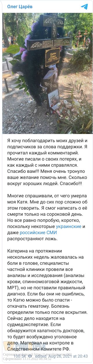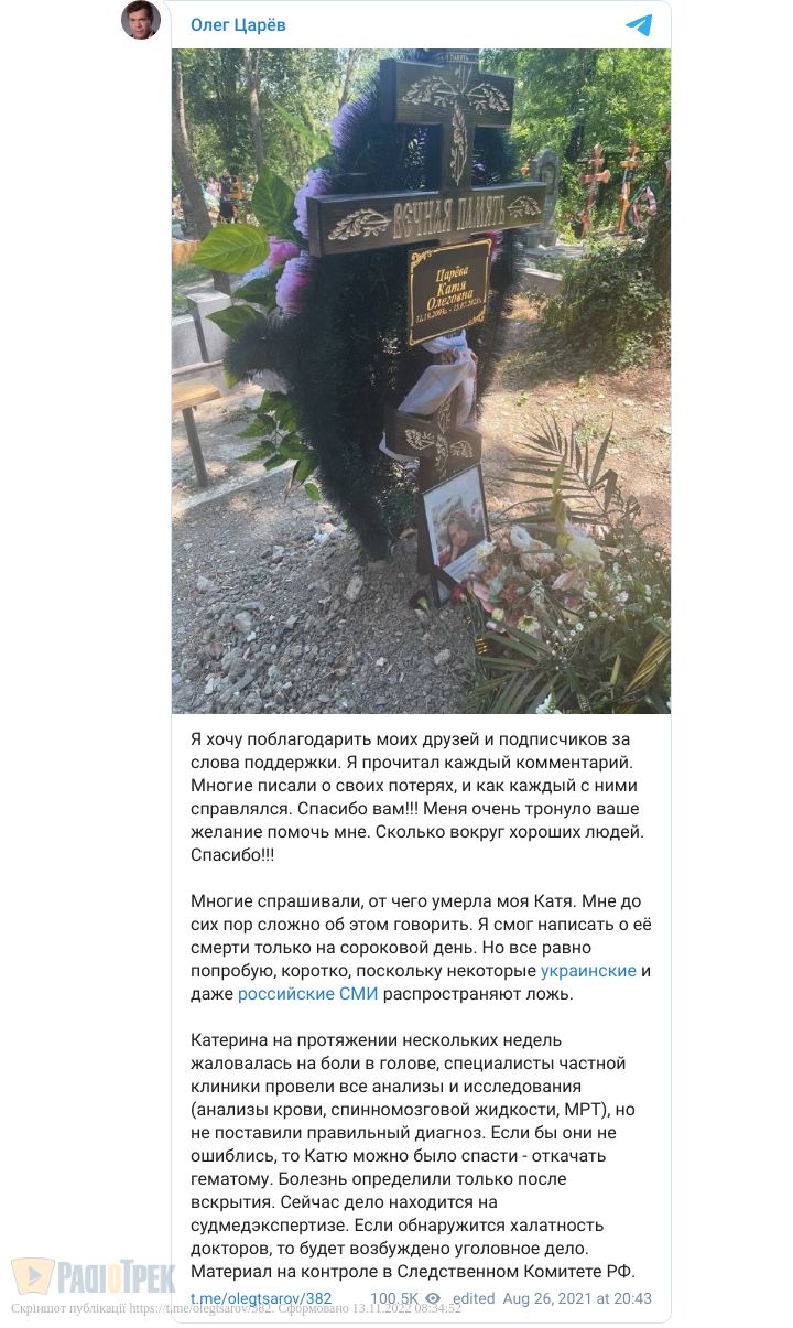 Колишній нардеп-втікач з «Партії регіонів» Олег Царьов розповів подробиці смерті його доньки. Про це сам Царьов, який перебуває у розшуку, написав у Telegram.
