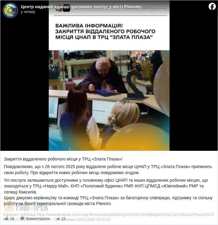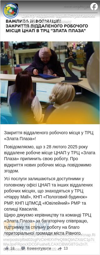 ЦНАП у приміщенні Злата Плази більше не працюватиме. Міська рада повідомила про закриття цього віддаленого робочого місця. Нагадаємо, у торговому центрі адміністративні послуги рівнянам надавали впродовж 5 років.